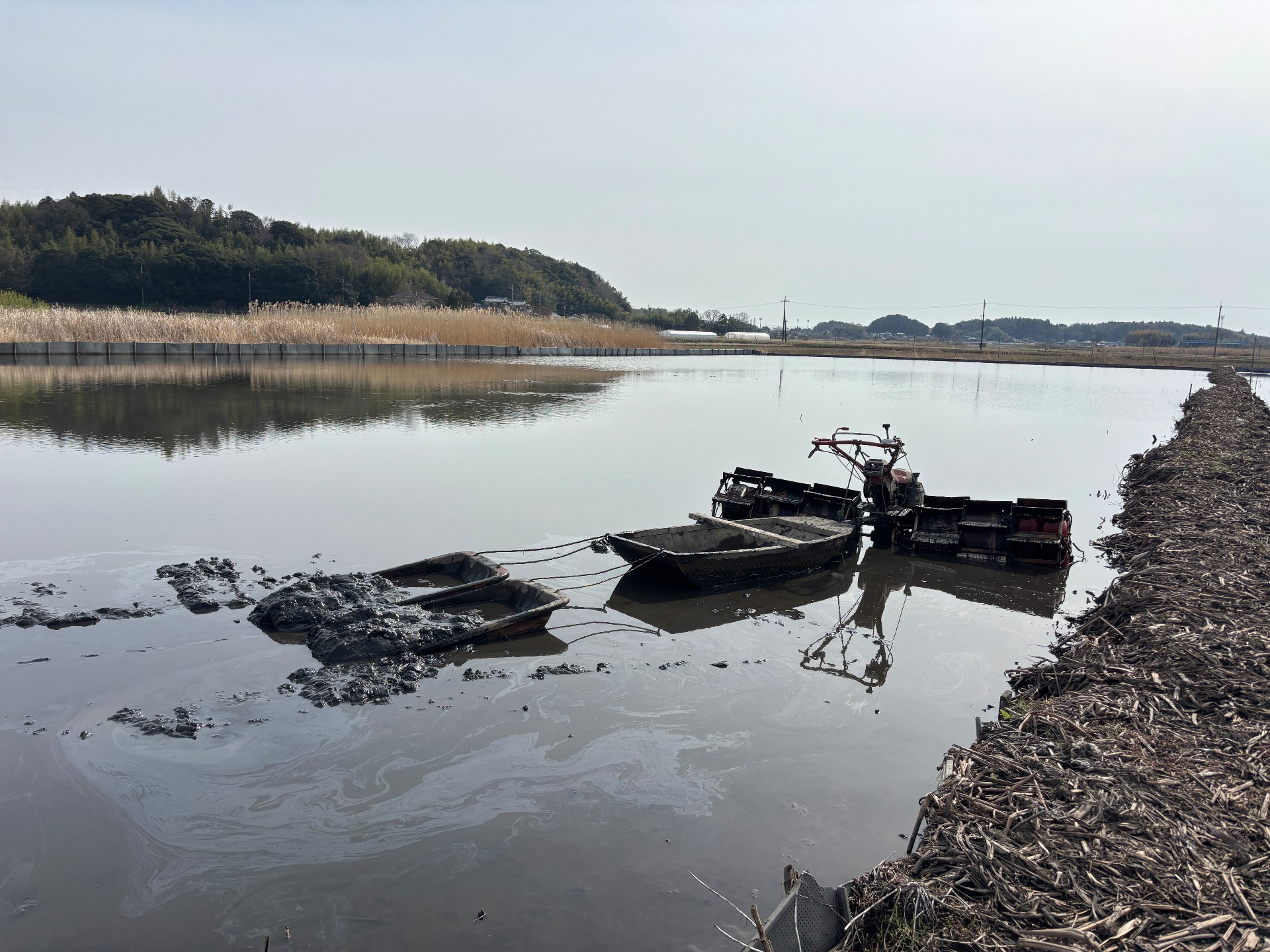 - 露地れんこんの植え付け準備で、田んぼの土を移動します。<div><br></div><div>れんこんの田んぼは全然平らではなく、土が水から露出してるような場所は雑草だらけになってしまいます。</div><div>そのため、収穫用の船に土を載せて、高いところから低いところに移動させます。</div><div><br></div><div>れんこんも、水稲も、田んぼが平らの方がいいですね。</div><div>半日、ずーーーーーーっと耕運機に乗ってました。</div><div>あと五時間くらいやれば、いい感じになると思います。</div><div><br></div><div>毎年やってるのに、全然平らにならない/(^0^)\ </div>